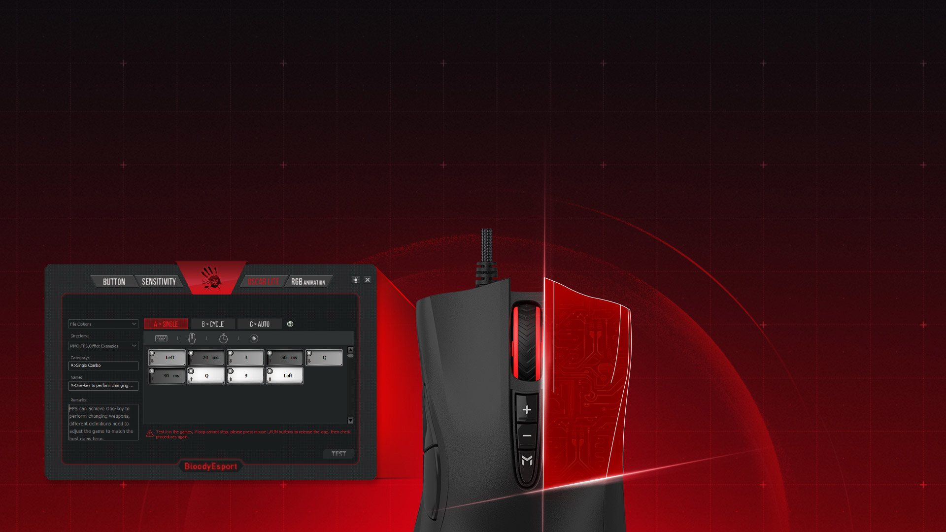 دکمه M این ماوس قابلیت سفارشیسازی دارد. با استفاده از نرمافزار مربوطه، میتوانید دکمه M را به عنوان یک ترکیب عملکردی منحصر به فرد سفارشی کنید.ماوس بازی ES5-RGB ESPORTS همچنین با نرمافزار Bloody Esports همراه است که تمامی نیازهای گیمرها و علاقهمندان به بازی را پاسخ میدهد. این نرمافزار به شما امکان میدهد تنظیمات مختلفی را برای ماوس خود تنظیم کنید و تجربهی شخصیسازی بیشتری را در بازی داشته باشید.با زمان پاسخگویی 1 میلیثانیه، ماوس بازی ES5-RGB ESPORTS بسیار سریع و دقیق عمل میکند و باعث میشود در بازیهای شما تمامی کلیکها به صورت فوری اعمال شوند.
