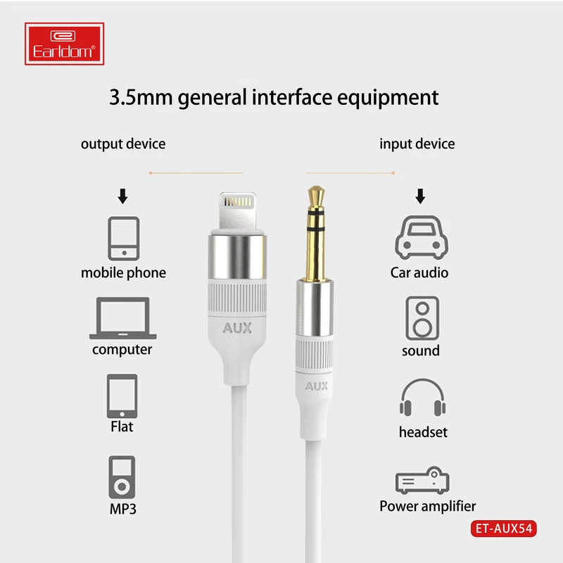 این روزها استفاده از پورت لایتنینگ در گوشی و تبلت ها توسط کمپانی اپل افزایش پیدا کرده است این پورت بر خلاف پورت میکرو یو اس بی، بالا و پایینش فرقی ندارد و می توانید بدون دردسر کابل را به آن متصل نمایید. استفاده از این پورت باعث شده تا شرکت اپل پورت صدا 3.5mm را از روی دستگاه ها حذف نمایند که در لین صورت شما برای شنیدن موسیقی توسط هدفون و یا اتصال گوشی به ضبط ماشین و اسپیکر نیاز به کابل مبدلی خواهید داشت. این مبدل صدا کمک می کند تا گوشی آیفون یا آیپد خود را به راحتی به دستگاه پخش موسیقی مانند، ضبط ماشین، اسپیکر، هدفون و غیره متصل کرده و آهنگی با صدایی شفاف و با کمترین میزان نویز را بشنوید. این کابل ارلدام از طریق جک 3.5 میلی متری متصل و طولی به اندازه 100 سانتی متر دارد.این کابل صدا دارای ساختار با کیفیت است که باعث می شود عمر طولانی داشته باشد. محل اتصال کانکتور به بدنه ی کابل با قطعه ای پلاستکی محکم شده است و روکش کانکتورها نیز آلومینیومی است و با دو لایه داخلی مقاوم سازی شده اند. شما با اتصال این کابل به هدفون و یا خروجی AUX ضبط خودرو در هر جایی که هستید می توانید به موسیقی گوشی دهید. این کابل با آیفون و آیپد سازگار است. برای استفاده از آن تنها کافیست آن را متصل کرده و موسیقی را پخش کنید.آلومینیوم به کار رفته در ساخت کانکتورهای آن از کیفیت بالایی برخوردار بود و ضد اکسید و خوردگی است. کابل آن نیز از مواد سیلیکونی است و دارای حالتی بسیار نرم و انعطاف پذیر است که در اصطلاح بازار به آن ژله ای نیز می گویند و داخل آن هسته مسی بدون اکسیژن به کار رفته است تا صدا را با کمترین نویز و افت کیفیت منتقل می کند.