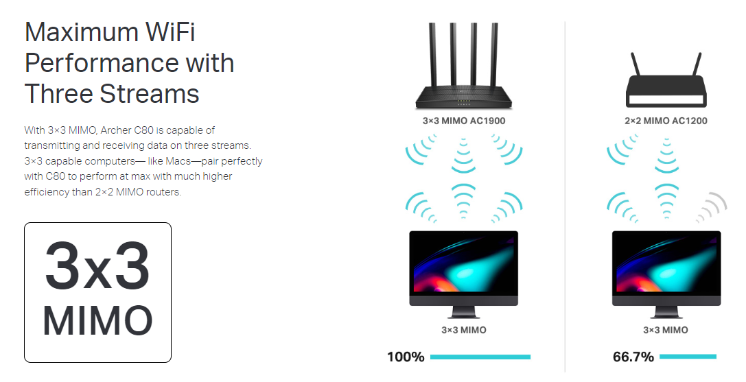Archer C80 تی پی لینک با MIMO 3×3 قادر به انتقال و دریافت اطلاعات در سه جریان است. رایانههای با قابلیت 3×3 – مانند مکها – کاملاً با C80 جفت میشوند تا حداکثر بازدهی بسیار بالاتری نسبت به روترهای MIMO 2×2 داشته باشند.